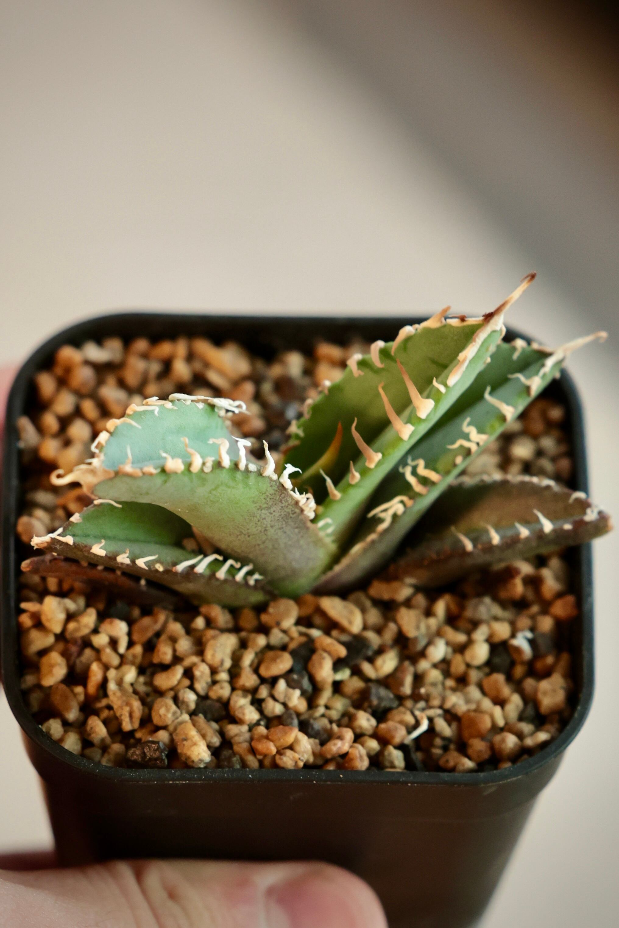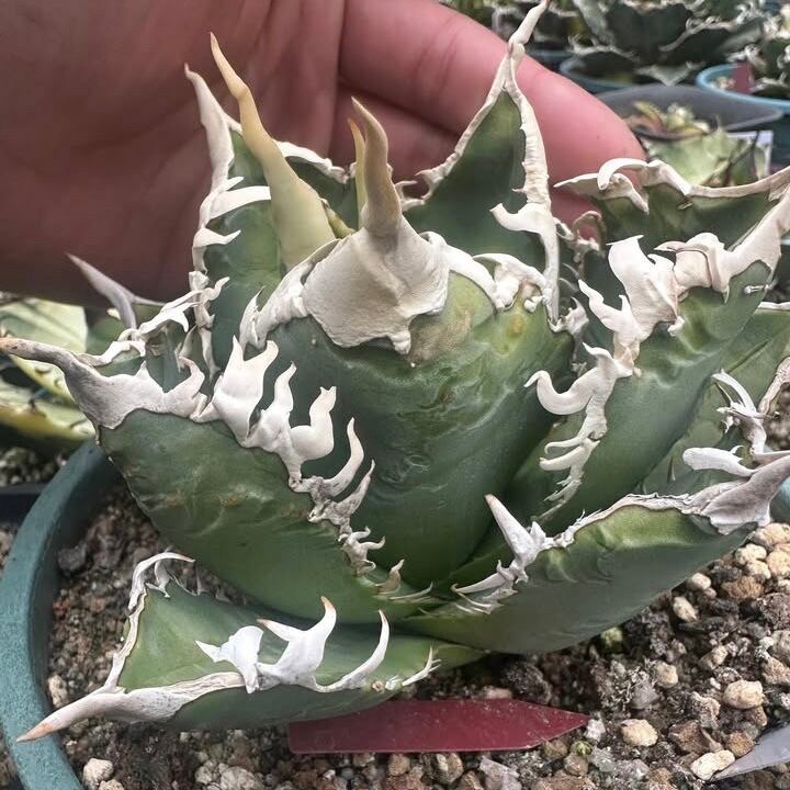 当店にて、中国福建省のナーセリーから輸入した Agave Titanota "白幽霊" (アガベ チタノタ シロユウレイ) となります。